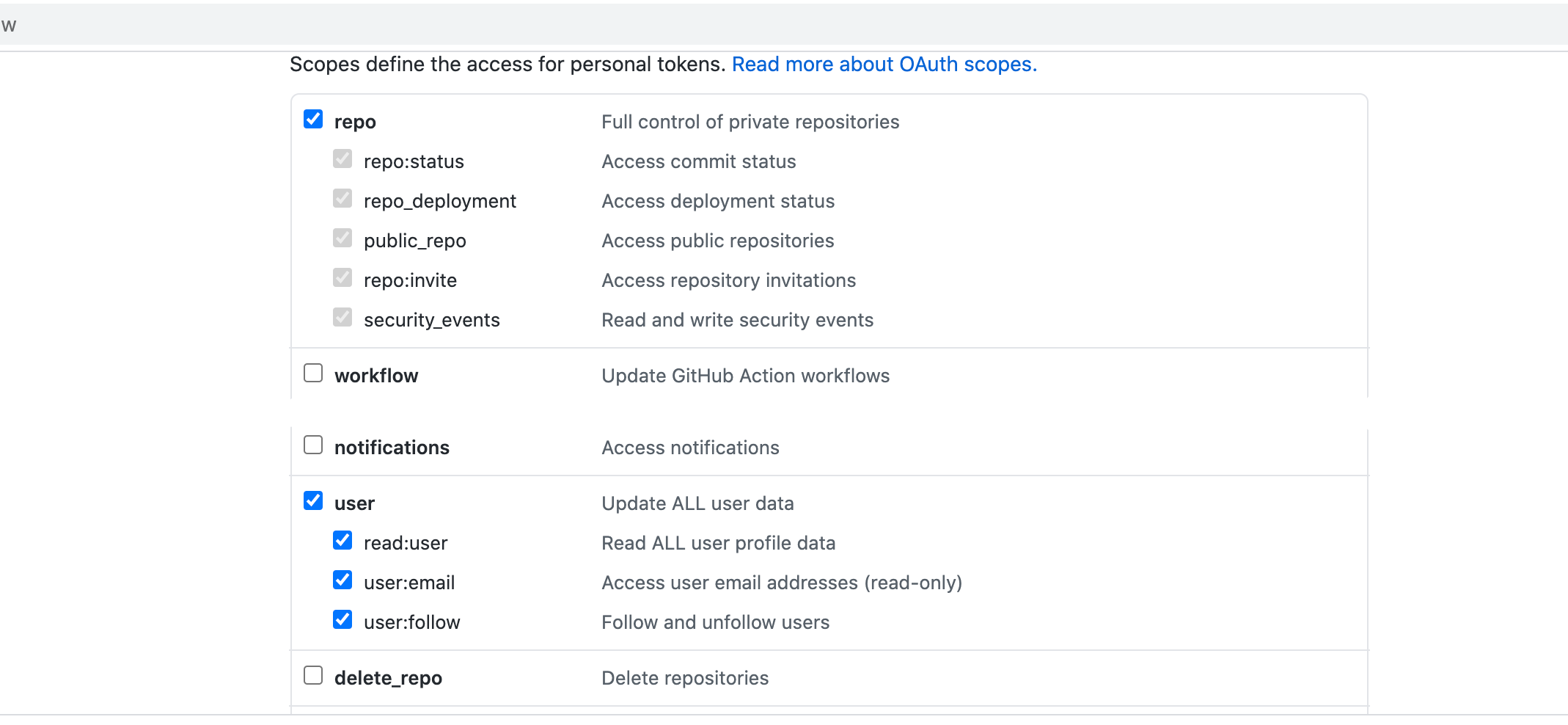 - Scopes: select all the repo and user options.