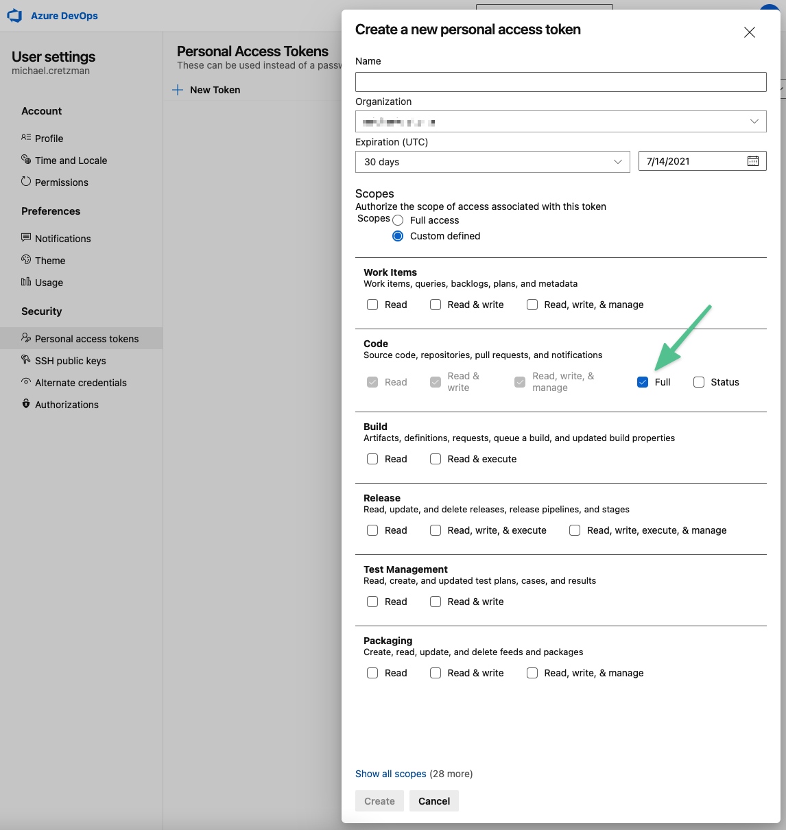 - Scopes: for Personal Access Tokens, Code: Full.