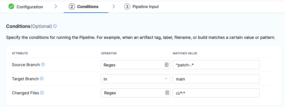 • Trigger a pipeline if the source or target branch in the Git event matches a specified pattern.